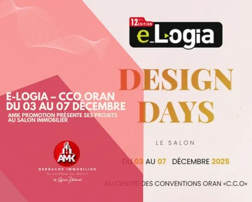 AMK Hebbache Immobilier a le plaisir d’annoncer sa participation officielle au Salon International de l’Immobilier E-Logia, qui se tiendra au Centre des Conventions d’Oran (CCO) du 03 au 07 décembre. Un rendez-vous incontournable pour tous ceux qui recherchent un bien immobilier haut standing, moderne et idéalement situé.
